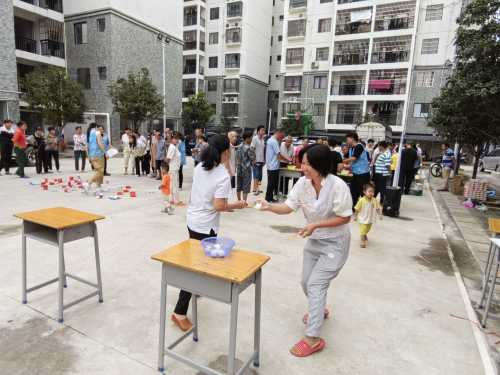 活动开始,由广西都安瑶族自治县民政局莫文涛副局长做活动开场致辞;莫文涛副局长发言结束后由社工简单介绍本次活动的内容、活动形式及活动规则等基础情况后就宣布活动正式开始。社工及志愿者引导参与活动的社区居民有序阅读关于项目、机构、精神障碍社区康复知识等宣传展架,同时对过路的社区居民积极派发宣传折页、讲解项目内容等;随后组织大家参加“精康知识”趣味互动,套中的洗洁精、洗衣粉、香皂、纸巾以及运送的乒乓球,都有社工贴好的精康知识竞猜题,一时间所有人都认真学习、细致阅读、专心查找,生怕错过任何一个正确的精康知识点,彼此讨论声、欢笑声交织,答对的开心去领小奖品,答错的则继续竞猜,将现场气氛推向高潮。